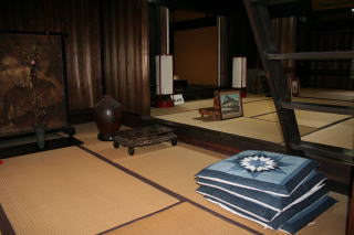 | 接客用の「なかのま」その奥が主人の寝室「おくのなかのま」となる。 この境二間は、両脇半間を板壁とし、 中央一間は戸を両側に引き込んでいる。 また、一段高く敷居を入れた帳台構(ちょうだいかまえ)となっている。 |