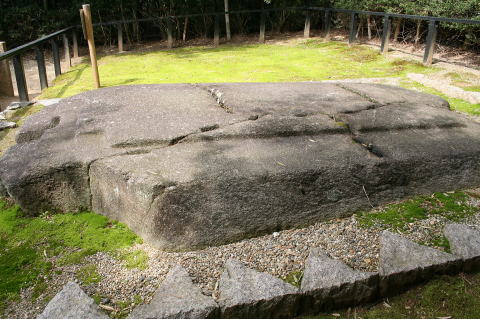 | 形から鬼の爼と呼ばれてきたが、 古墳の石室の底石であることが判明した。 くさびの跡があるが、後世に石材としてバラスように試みたもの。 |