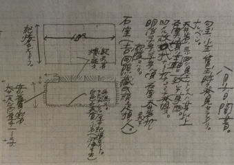 る古墳があります。馬見古墳群の中央群にある墳長200mの大型前方後円墳です。 主軸の向きは東西方向、段築は3段、両側くびれ部に造り出しがあります。幅約20m の盾形周濠がめぐります。周濠の南側は田畑となりますが、地割に痕跡をたどること ができます。 町教育委員会の発掘調査で幅約20m 、高さ3m以上の外堤や、その外周に区画溝が設 けられていることがわかりました。巣山古墳に続く、古墳時代中期前葉(5世紀前半) に造られました。 1882 (明治15 )年には勾玉や管玉、棗玉 (ナツメの実のような楕円形の玉)など が出土し、86年に陵墓の候補地として宮内省(当時) の御陵墓伝説地になりました。そ の後、三吉陵墓参考地という固有名称が付けられて、現在に至ります。なお、これまで の回にも登場した「陵墓参考地」ですが、この名称は1926 (大正15 )年10月の「皇 室陵墓令施行規則」に出ています。 奈良県で生まれた考古学者/森本六爾(1903~36 )が残した野帳(フィールドノート)に 人から聞き取った埋葬施設の見取り図です。今では知ることのできない貴重な記録です。 細長い5点の凝灰岩を並べた天井石と、薄く割れた安山岩の石材を積んだ壁が描かれ ています。床面には白色の石英の小石が敷かれ、朱が混じっていたといいます。つま り、埋葬施設は竪穴式石槨だということです。 天井石を凝灰岩と記しています。兵庫県の加古川流域から運ばれてきた凝灰岩の一種 となる竜山石でしょうか。葛城市の屋敷山古墳でも、竜山石の天井石が見つかっていま す。しかし、近畿の大型の中期古墳にみられる長持形石棺についての記載はありませ ん。まだ知られていない情報があるのかもしれません。 中央群では、墳長100m前後の帆立貝形前方後円墳の池上古墳、乙女山古墳、前方 後円墳のナガレ山古墳、佐味田宝塚古墳などで、木棺の底側・蓋を粘土で覆う粘土槨 が埋葬施設になったと推定されています。一方、墳長200m以上の大型前方後円墳の 巣山古墳と新木山古墳は竪穴式石槨です。格付けを示したものでしょう。記録のおかげ ではっきりしました。 森本は前方部頂上近くの南側にある円筒埴輪列の現況略測図面も残しています。南側 の前方部側面の第2段平坦面にめぐらされた円筒埴輪列のことだと推測されます。 墳丘第1段平坦面の円筒埴輪列の様子は、2010年の宮内庁の調査で確かめられ ました。南側の墳丘裾を中心に12ヶ所のトレンチ(調査区)が設けられました。墳丘 をかたちづくる途中の地山の状態の時に埴輪をならべ、その後に盛土をしながら、円筒 埴輪の最下段を埋めたと報告されています。なお形象埴輪としては、壺形、蓋形,家 形、短甲形が確認されています。 |